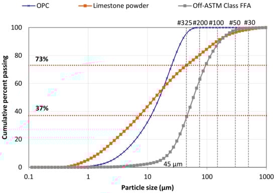 Particle size distribution of OPC, limestone powder, and off-ASTM Class FFA.
