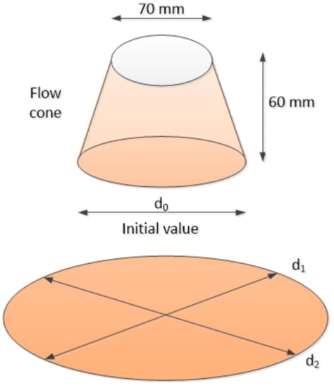In order to evaluate the relationship between flowability and compressive strength of mortar mixtures, a flow spread test was conducted [27]. The flowability of each mixture was assessed using ASTM C 1437 mortar flow table test as presented in Figure 4. The measured flow test data based on the deformability relative to the diameter of the mortar mixture before and after a collapse were used to calculate the relative flow area (Гm) using Equation (1) [28]. A larger value of Гm indicates higher deformability of the mortar mixture.