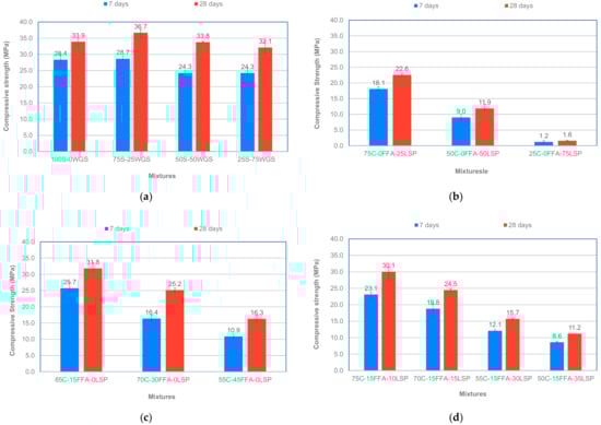 Finally, ternary mixtures consisting of both FFA and LSP provided higher or comparable strength compared to only LSP or FFA addition (Figure 5d). For example, the 28-day compressive strength in [15% FFA + 10% LSP] and [15% FFA + 15% LSP] mixtures were 30.1 MPa and 24.5 MPa, while the mixture having only 25% LSP and 30% FFA had the strength of 22.6 MPa and 25.2 MPa, respectively. Therefore, it is concluded that the combined use of FFA and LSP provides a synergistic effect on the compressive strength development of the mortar mixture.