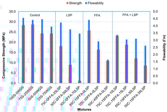 Figure 6 presents the relative flowability and 7-day compressive strength of the mixtures. The Гm for all mixtures was ranged from 1.64 to 4.56 variously. The standard deviation of Гm for each mixture was ranged from 0.01 to 0.67. For control mixtures, the replacement of normal sand with WGS up to 50% did not show much difference in the flowability (the average Гm = 4.48), whereas the 75% replacement with WGS dropped the flowability (Гm = 3.94). For the mixtures containing LSP and FFA, the small amount of cement replacement with LSP and FFA did not influence the flowability. Interestingly, as LSP and FFA’s replacement level increases, the flowability decreases regardless of the type of materials. This result may be attributed to the irregular shape of large particles of LSP and coarse particles of FFA. In general, the use of fly ash in the cementitious system leads to the mixture’s improved flowability due to its spherical particle shape [32]. However, the obtained test results were different from the typical flowability of the mixture containing fly ash. It should be noted that the LSP used in this research was obtained after crushing, milling, and sieving limestone, resulting in angular shapes. The fly ash also is a low-quality one that contains more angular shapes and coarse particles, as shown in Figure 3.