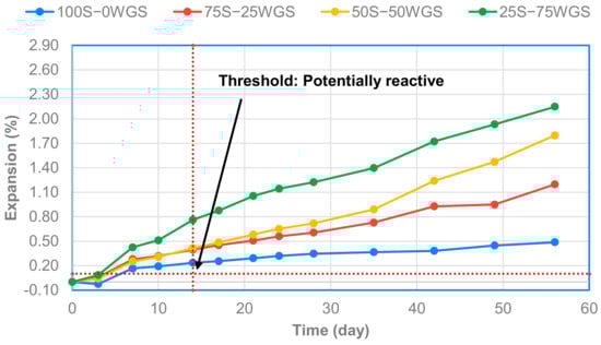 Figure 7 presents the ASR expansion characteristics of control mixtures. The expansion of the control mixtures immersed in 1N NaOH solution at 80 °C was low up to 3-day. However, it exceeded 0.1% after 7-day, which falls in the potentially reactive aggregate criterion (14-day expansion) according to the C 1260/1567 regardless of reactive river sand and sand-WGS combination. For example, the expansion of the mixture containing siliceous reactive sand was 0.24% at 14-day whereas the expansion of the mixture having the combination of 25% sand and 75% WGS was 0.76% at the same age.