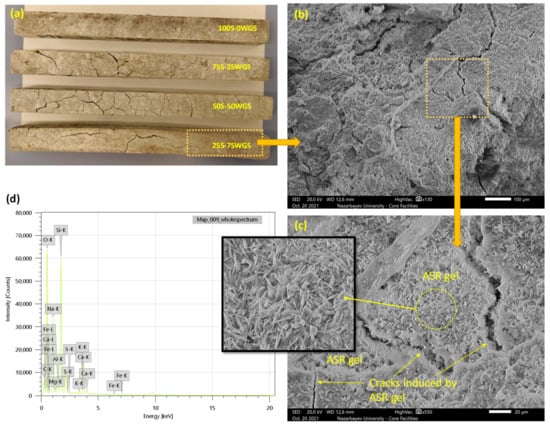Figure 8 presents expanded and cracked samples of control mixtures after a 56-day ASR test and SEM images and energy-dispersive spectroscopy (EDS) analysis of the mixture containing 75% sand and 25% WGS as a representative sample. EDS spot analysis was conducted to identify the chemical composition of ASR gel products. As shown in Figure 8a, all mixtures containing reactive river sand or the combined reactive sand and WGS showed many cracks on the surface of each mixture. The SEM micrographs (Figure 8b,c) present that a lot of ASR gels formed on the surface of WGS, which are more fluffy and thin-skinned reaction products. Moreover, some cracks are filled with ASR gels. These ASR gels absorb much water, resulting in volume expansion and more crack propagation. The EDS analysis confirms the formation of ASR gel in the mixture containing WGS (Figure 8d).