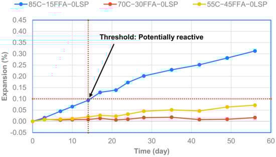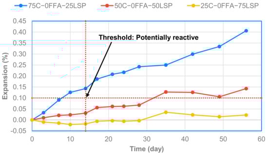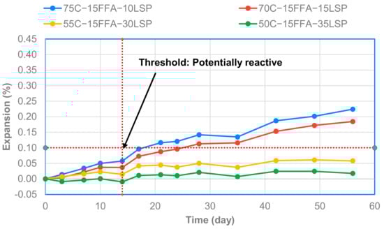 Figure 9 shows ASR expansion characteristics as a function of LSP replacement at a fixed amount of aggregate (75% reactive sand and 25% WGS). Meanwhile, the expansion of mortar bars incorporating 25% LSP by cement mass was 0.14% at 14 days. Though replacing cement with 25% LSP contributed to a more than two-times reduction in the expansion compared to the control specimen (0.40% expansion for the mixture having 75% sand and 25% WGS), it still exceeded the potentially reactive threshold value. When the test period was extended to 56 days, a significant expansion was taken between 14 and 56 days. The expansion values at 28-day and 56 days were 0.24% and 0.41%, respectively.