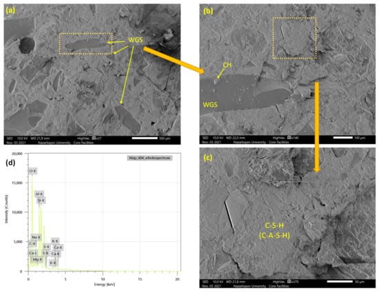 SEM micrographs of ternary mixture after 56-day ASR test: (a) ternary mixture containing 55C-15FFA-30LSP; (b) enlarged SEM image of 55C-15FFA-30LSP mixture; (c) C-S-H or C-A-S-H formation on the surface of WGS; and (d) EDS pattern of C-S-H or C-A-S-H.