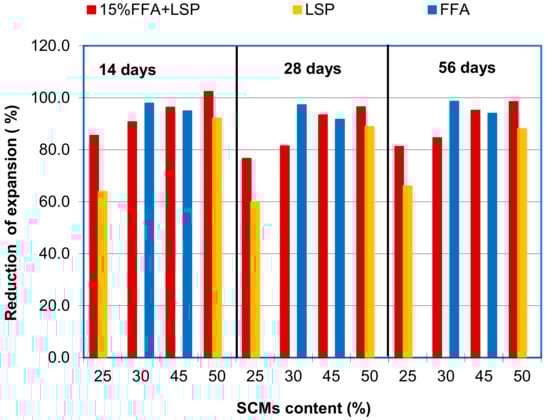 However, adding a relatively large amount of LSP to the ternary mixture (30% or more by mass of cementitious material) reduced expansion significantly: 56-day expansion values ranged from 0.06% to 0.02% as shown in Figure 11. Additionally, the mortar bar containing 15% FFA and 30% LSP has a higher reduction percentage (96.3%, 93.4%, and 95.2% at 14, 28, and 56 days) than 45% FFA specimen (94.9%, 91.7%, and 94.0% at 14, 28, and 56 days) regardless of age. The ternary mixture having the highest replacement level of LSP (15% FFA-35% LPS) produced the same result. This result indicates that there possibly exists a threshold beyond which the resistance mechanism becomes effective, and this threshold can be expected to vary from one FFA to another or one LSP to another.