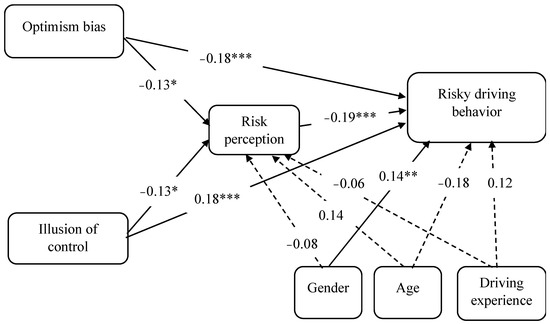 Path analysis of the determinants of risky driving behaviour (n = 366). Standardized path coefficients are reported. Non-significant paths are indicated with dotted lines. * p < 0.05; ** p < 0.01; *** p < 0.001.