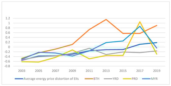 Figure 1. During the studying period, EPD eased from −0.555 in 2003 to 0.184 in 2019. It shows that energy market reform has been gradually and effectively implemented, which benefited from the policy of price mechanism reform during the 13th Five-Year Plan period. From the empirical results, the distortion trend of energy prices in urban agglomerations is roughly the same as that of average energy prices, showing a state of fluctuation and rising. Different from the other urban agglomerations, it is important to note that the positive distortion in BTH has deepened since 2009. As the BTH is close to the political center of China, the formulation and implementation of relevant policies are more rapid. It is also conducive to the smooth implementation of energy market reform. Therefore, with the sharp rise in the prices of energy and raw materials such as oil, coal and non-ferrous metals, the positive price distortion has been exacerbated. Although the degree of distortion in the other three regions is negative, all of them have been alleviated to varying degrees.