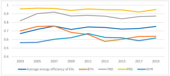 Table 6). Energy efficiency of China’s EIIs in different cities is significantly different, which indicates unbalanced regional development. The average degree of energy efficiency is 0.729, showing great potential for efficiency improvement. Xiamen showed the highest energy efficiency (0.975) with the implementation of distributed energy project policy and technological transformation and upgrading. Xining showed the lowest energy efficiency (0.515) with the old extensive growth mode of “high input and low efficiency”.
