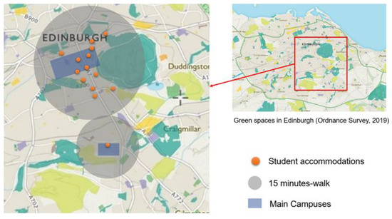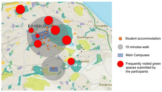 Edinburgh was reported to be the top city for green space in 2017 based on the satellite maps, with 49% of green space [52]. Figure 1 is based on the map of different types of green spaces in Edinburgh [53] and shows the many public urban green spaces accessible to students.