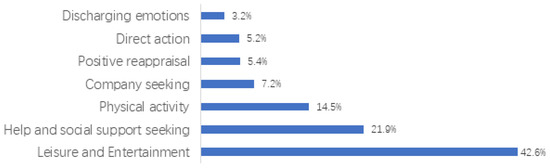 The emotion-focused coping strategies consist of behaviors used to relieve the discomfort caused by stressors. ‘Leisure and entertainment’, which was the most cited coping strategy, comprised recreational activities such “Listening to music”, “watching movies” and “playing video games”.