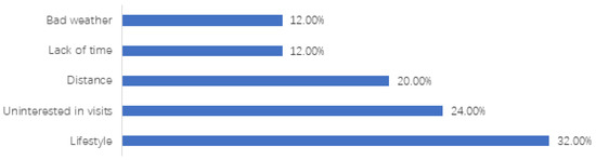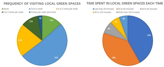 The majority of participants (51%) reported visiting green spaces at least once a week and spending less than an hour there on average (Figure 3).