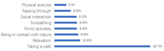 Additionally, a list of activities students usually preferred to undertake in green areas is presented in Figure 4. Eight categories were summarized and classified. Notably, ‘taking a walk’ was an important activity, taking almost 40% of all responses. ‘Relaxation’ mainly included students using the green spaces around the university and accommodations to relax and relieve stress in their spare time; “being in contact with nature” consisted of watching wildlife and enjoying the scenery; “picnic activities”, primarily BBQ, was also widely conducted; “sunbathing” and “social interaction”, such as meeting with friends, played essential parts in green activities; “passing through” was a kind of activity that students who lived close to green spaces often carried out on their ways; “physical exercise” including soccer, tennis, mountain climbing, and jogging was the least common green activity.