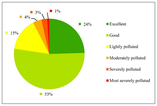 The air quality level with the highest frequency in Northeast China in 2015 was level 2 (good), accounting for 24% of the total days of the year, followed by level 1 (excellent) at 53%, level 3 (lightly polluted) at 15%, level 4 (moderately polluted) at 4%, level 5 (severely polluted) at 3%, and level 6 (most severely polluted) at 1% (see Figure 1). From the perspective of seasonal distribution, the frequency of lightly polluted or worse than slightly polluted air quality was ranked in the order of winter, autumn, spring, summer, while the ranking of excellent and good levels was the opposite (Figure 2).
