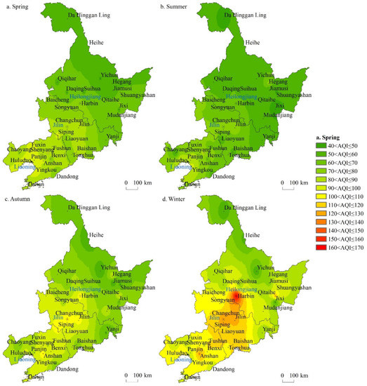 The air quality in Northeast China shows typical characteristics of winter–summer differentiation. The degree of change in air quality varies with the seasons in each province. For example, the air quality of Heilongjiang Province has an AQI in the range of 100 in winter and summer, while the AQI in Liaoning Province fluctuates between 80 and 110. The AQI in the northern area in spring and summer shows a gradient increasing trend with decreasing latitude, while the AQI in autumn and winter shows characteristics of circle diffusion and attenuation, with the provincial capital as the high-value center (Figure 3). For example, in winter, the AQI of Harbin is the highest. From Harbin to the south, a regional circle with the worst air quality composed of Changchun, Jilin, Siping, Liaoyuan, and Fushun has formed. The AQI of the cities within this circle was higher than 110. The main reason is that the provincial capitals are more densely populated, and the anthropogenic emissions caused by gasoline and coal-fired heating devices have aggravated urban air pollution [49]. Moreover, illegal emissions and biomass combustion in winter are the main drivers of the formation of dense fog, which makes air pollution more serious [50].