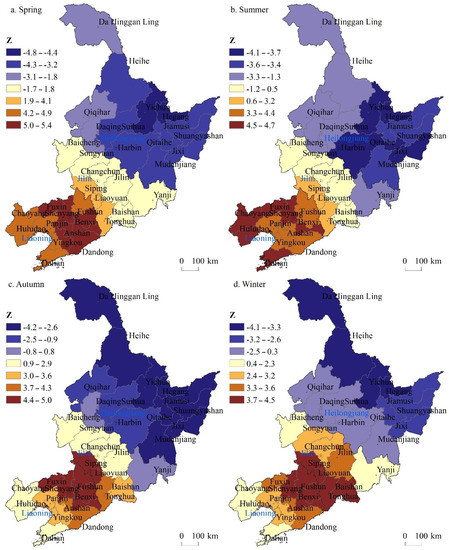 The Moran’s I values of urban AQI were 0.71 (spring), 0.67 (summer), 0.55 (autumn), and 0.43 (winter), with corresponding Z-values of 13.61, 12.89, 10.72, and 8.48. The Z-values were greater than 1.65 with a confidence level above 90%, indicating that a significant positive spatial autocorrelation of AQI in the four seasons with a significant spatial agglomeration pattern. The Getis-Ord of AQI indicates that the average urban AQI conforms to the statistical characteristics of the hot spot analysis clustering mode. Visually expressing the Z-value, it is concluded that significant hot spots with Z > 1.96 and p < 0.05 are mainly distributed in Liaoning and Jilin Provinces (Figure 4). The distribution of significant AQI hot spots in these two provinces is concentrated; they are mainly located in Liaoning in spring and summer, and move northward in autumn and winter, covering the central area of the two provinces. Significant hot spot cities have higher AQI values and are surrounded by neighboring cities that also have high values, which means that they are statistically high AQI cluster areas. In winter, Harbin City in Heilongjiang Province was shown to have a high AQI value, but there were no significant hot spots surrounded by other cities with high AQI.
