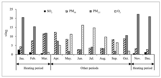 Seasonal changes in priority pollutants in Northeast China were significant. In autumn and winter, PM2.5 became the priority pollutant on most days, with a cumulative occurrence of 120 days, accounting for one-third of the year. PM10 was the priority pollutant on 77 days. The month when the highest number of days PM10 became the primary pollutant was April, with a total of 10 days, mainly because the wind and sand were more serious in spring than in other seasons. Sand and dust on the ground were blown by the wind transported from upstream to the local area, causing increased concentrations of PM10 and other atmospheric particulates [51]. O3 was the priority pollutant on 73 days of the year. Its monthly change pattern was contrary to PM2.5, showing an inverted U-shaped distribution pattern. The urban thermal environment in summer increases the risk of air pollution [52]. SO2 appeared as the priority pollutant on the fewest days, only eight days of the year (Figure 5). The changes in the frequency of primary pollutants throughout the year indicate that the heating period (November through March) is a critical period for air pollution control in Northeast China.