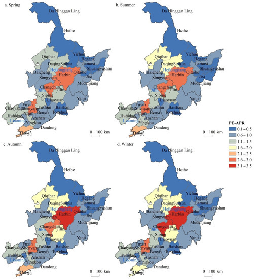 The population exposure–air pollution risk was characterized by high spatial differentiation in provincial capital cities and low in non-provincial capital cities (Figure 6). The PE-APR in provincial capital cities was greater than 2, among which Harbin had the highest risk (PE-APR > 3.0). The PE-APR in Dalian, Suihua, Qiqihar, Jilin, and other cities was also relatively high (PE-APR > 1). Overall, 61% of cities had a risk level lower than the regional average (0.5 < PE-APR ≤ 1). The lowest population exposure–air pollution risk area (0.1 < PE-APR ≤ 0.5) was concentrated in northern Heilongjiang, especially Da Hinggan Ling Prefecture, Qitaihe City, and Yichun City, mainly due to the good air quality throughout the year and the sparse population there. The cities with high PE-APR (2.5 < PE-APR ≤ 3.5) were Harbin, Changchun, and Shenyang; the cities with intermediate PE-APR (1.5 < PE-APR ≤ 2.5) were ranked as autumn/winter, summer, and spring.