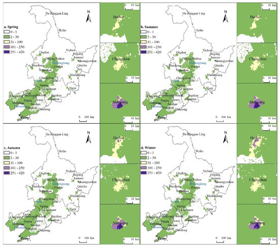 PE-APR was divided into five levels on a grid scale: level 1 (0–1), level 2 (2–30), level 3 (31–100), level 4 (101–250), and level 5 (251–420). PE-APR changed significantly during the four seasons. Level 1 indicates that air pollution exposure levels in the area are relatively lower than or equal to the average level of the entire study area. The grid number of level 1 in descending order corresponded to summer, spring, autumn, and winter. Level 2 and above indicate that air pollution exposure levels in the area are higher than the average level for the entire study area. The grids of levels 2–5 are mainly located on the central axis connecting Harbin, Changchun, Shenyang, and Dalian, forming a belt-shaped area along the Harbin–Dalian Railway, and multiple scattered points in cities at various levels (Figure 7). This area cuts through the central region of the three northeastern provinces, starting from central Heilongjiang Province and reaching southernmost Liaoning Province, covering the four major urban clusters: the Harbin–Dalian–Qiqihaer Economic Zone, the Changchun–Jilin–Tumen River Pilot Zone, the Liaoning Coastal Economic Belt, and the Shenyang Economic Zone. Figure 6 shows that areas with PE-APR greater than 1 are not significantly distributed around the Harbin–Dalian Railway and do not reflect the scattered points of prefectural cities. Figure 7 shows that the PE-APR of provincial capital cities is above level 3, and the central urban area within a 10 km radius is characterized by circles of decreasing levels. Therefore, the grid-scale map can show the temporal and spatial characteristics of PE-APR between and within cities in a more detailed manner.