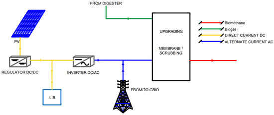 The proposed plant aims to integratine renewable sources of energy, i.e., a photovoltaic field, into a biogas upgrading plant, as shown in Figure 1. Note that three layouts are studied and compared in this work. These layouts only differ for the selcted biogas upgrading technology, namely water scrubbing, two-stage membrane separation, and three-stage membrane separation.