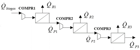 Several configurations may be developed considering a variable number of membranes and compressors. As mentioned before, this work addresses two-stage MS and three-stage MS. For example, a layout of a three-stage MS biogas upgrading unit is shown in Figure 2.