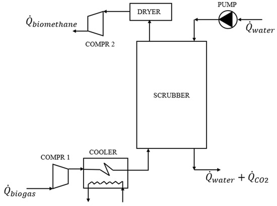 The simplified layout of the plant related to the pressure water scrubbing technology is represented in Figure 3. The system consists of the following components: