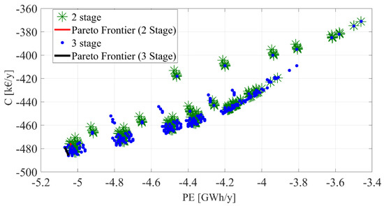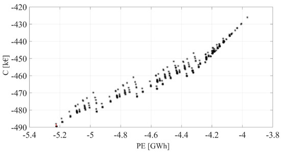 Figure 4 summarizes the results of these analyses, displaying the selected object functions, namely costs (C) and primary energy (PE). Note that the operating costs are negative because the savings due to the biomethane exporting and energy saving certificates overcame the plant operating costs due to maintenance and the purchasing of electric energy. PE is negative for similar reasons; in fact, the primary energy linked with the volume of biomethane exported is significantly higher than the primary energy consumption due to the electricity withdrawn from the grid.