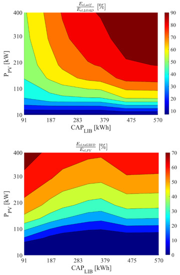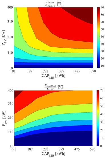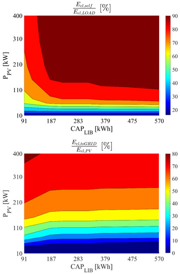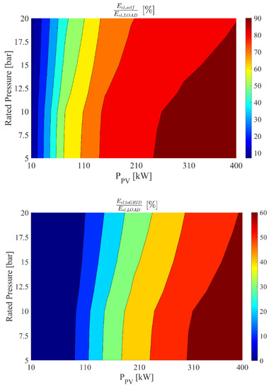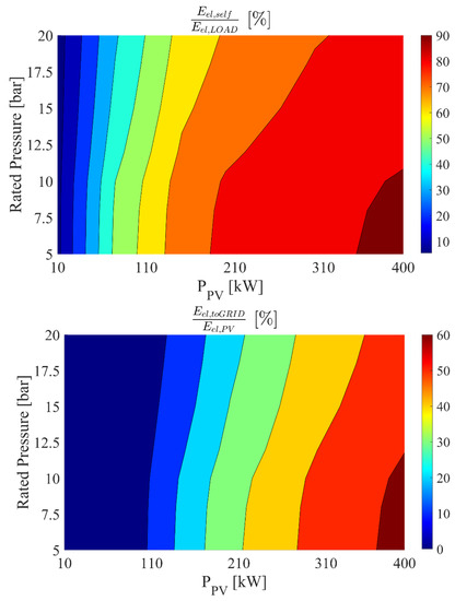 Figure 10 displays the energy performance of the proposed renewable plant adopting a two-stage membrane biogas upgrading process for a storage system capacity of 364 kWh and a simultaneously varying system-rated pressure and photovoltaic capacity. This figure is consistent with the above described trends. In fact, as explained before, the increase of the rated operating pressure significantly increases the plant power demand, allowing the plant to exploit a higher share of renewable produced electricity (see also Figure 9). Then, for higher operating pressure and higher PV field, the electricity exported to the grid (Eel,toGRID) is limited, but the self-produced electricity (Eel,self) matches roughly 90% of the plant electricity demand.
