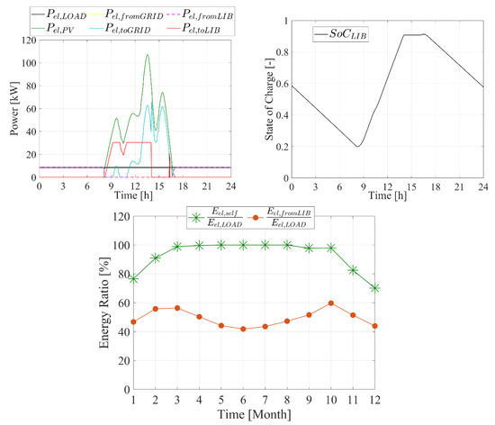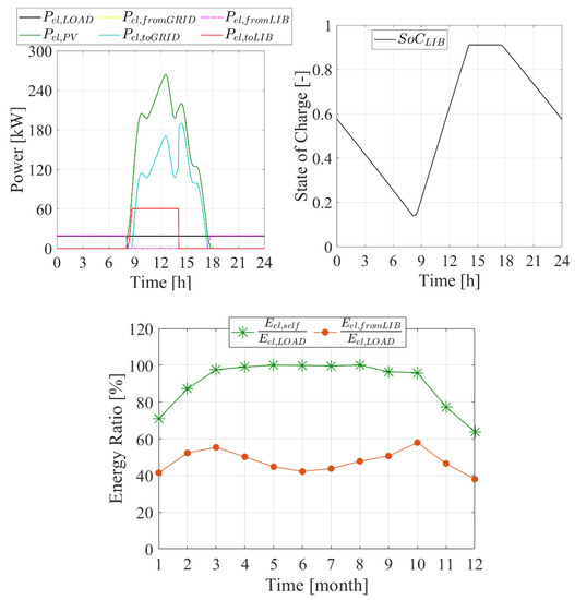 Higher operating pressures lead to higher power demand for plant compressors. Therefore, the plant adopting a higher operative pressure is able to exploit a higher share of the produced renewable electricity. In fact, as clearly displayed in Figure 8, the plant adopting an operative pressure of 20 bar, a PV field capacity of 400 kW and a battery capacity of 365 kWh is able to self-consume almost 50% of the produced electricity (see Eel,toGRID/Eel,PV Figure 8). At the same time, roughly 90% of plant electricity demand is met by the self-consumed electricity (Eel,self). This point is clearly displayed by Figure 9. In fact, the photovoltaic field (Pel,PV) with the lithium-ion battery (Pel,fromLIB) meets the power load (Pel,LOAD) throughout the day without withdrawing electricity from the grid (Pel,fromGRID), Figure 9. According to the aforementioned trends, the plant is almost grid self-independent from February to October. The battery plays a crucial role in such a plant, matching around 40 ÷ 60% of Eel,LOAD, Figure 9.