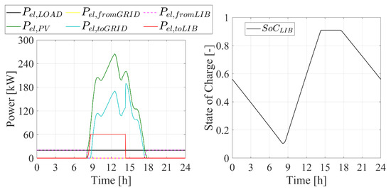 The fact that the 2SMP optimal layouts is featured by the upper bound of the PV field and the battery capacity is equal to 364 kWh is for the same reasons as discussed above for 2SMP. These trends are shown in Figure 11 and Figure 12. In fact, these figures highlight that the system is almost grid independent, in particular 90% of the plant energy demand is matched by the produced electricity (Figure 11). In fact, the battery is able to store a significant amount of the surplus renewable power produced by the PV field and to use this stored energy for matching the plant electricity demand for the whole day (Figure 12).