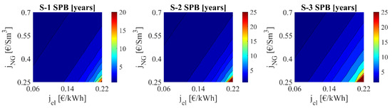 As expected, the increase of the parameter α leads to a significant enhancement of the reference system, i.e., the cogeneration plant, letting CHP achieve better results with respect to the proposed optimal scenarios. In fact, for value of α greater than 0.50, PES becomes negative, which means that the avoided primary energy of CHP is greater than the proposed scenarios, as shown in Figure 14. Therefore, the ratio of thermal energy exported to local users is crucial, in fact such point is able to make the conventional approach of burning biogas into a CHP plant more energy convenient with respect to every biogas upgrading strategy. This result is deeply related with the fact that the biogas upgrading process is remarkably energy demanding. Note that the surplus electricity exported to the grid is limited, accounting for less than 13% of the avoided primary energy for all proposed scenarios. Finally, Figure 14 confirms that the water scrubbing process reaches better results from the energy point of view. Figure 15 summarizes the economic performance of the proposed optimal scenarios compared with CHP. In particular, the electricity and natural gas selling costs are mutually varied. The economic performance of the analyzed scenarios is dramatically affected by the natural gas selling price (jNG). In fact, for a value of jNG greater than 0.55 €/Sm3, all the scenarios achieve a SPB lower than 10 years, regardless the electric energy selling cost and the share of thermal energy exported.
