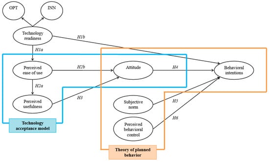 The personality reflected in TR is regarded as a significant antecedent to the cognitive constructs of TAM in the extant literature. For example, Lin et al. [10] integrated TR into TAM and proposed the technology readiness and acceptance (TRAM) model to predict individuals’ use intentions of an online stock trading system. The analysis results using 406 responses revealed a strong direct impact of TR on perceived ease of use and exhibited the psychological process of TR to perceived ease of use, then to perceived usefulness which subsequently increases use intentions. Shin and Lee [13] tested individuals’ adoption of mobile payment services using a combined model of TR and TAM. Their results exhibited the meaningful link between TR and perceived ease of use. Kim and Chiu [46] examined consumers’ willingness to accept smart sports wearable technology and positive TR which is consisted of optimism and innovativeness considerably affect perceived ease of use. Meanwhile, a number of scholars demonstrated the direct influence of TR on behavioral intentions [34,47]. For instance, Lin and Hsieh [47] explored the relationship between TR and behavior in adopting self-service technologies (SSTs), and their results statistically supported the link. Chen et al. [48] investigated how TR influences the continuance use intentions of electronic appointment system and reported that both optimism and innovativeness aid to increase the intentions to use. Based on this theoretical background and empirical evidence, TR is postulated to be a critical antecedent of perceived ease of use, which in turn affects perceived usefulness, attitude, and behavioral intentions, and also to be an immediate antecedent of behavioral intentions. Given the above, it is appropriate to formulate the following two hypotheses: