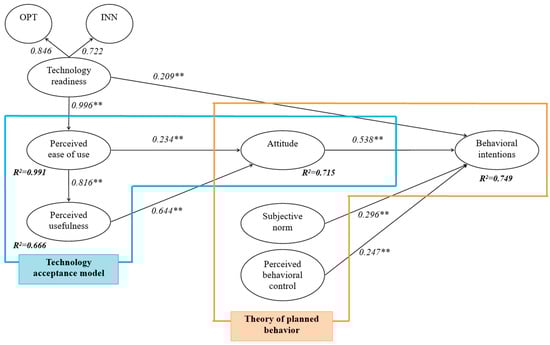 Structural equation modeling (SEM) was performed to validate the hypotheses among study variables. The goodness-of-fit statistics (χ2 = 905.550, df = 283, χ2/df = 2.622, p < 0.001, RMSEA = 0.085, CFI = 0.939, IFI = 0.939, NFI = 0.913, TLI = 0.929) indicate a satisfactory fit of the model. Hypotheses were evaluated based on the results of SEM, and Figure 2 and Table 4 present the details. The results indicated that TR exerted a positive and significant influence on both perceived ease of use and behavioral intentions. Therefore, Hypothesis 1a (β = 0.996, t = 12.228, p < 0.001) and Hypothesis 1b (β = 0.209, t = 3.731, p < 0.001) were supported. The impact of perceived ease of use was tested and the positive impact on perceived usefulness (β = 0.816, t = 16.077, p < 0.001) and attitude (β = 0.234, t = 3.502, p < 0.001) were statistically supported. Accordingly, the results supported Hypotheses 2a and 2b. Moreover, perceived usefulness was found to enhance attitude (β = 0.644, t = 9.539, p < 0.001) and attitude increased behavioral intentions (β = 0.538, t = 9.815, p < 0.001) which supported Hypotheses 3 and 4. That is, the associations among study variables rooted from TAM were all supported. In addition, Hypotheses 5 (β subjective norm --> behavioral intentions = 0.296, t = 6.270, p < 0.001) and 6 (β perceived behavioral control --> behavioral intentions = 0.247, t = 5.013, p < 0.001) were supported. Thus, the results supported the links proposed in TPB as well. All study variables explained 74.9% of total variance in behavioral intentions, and therefore the proposed theoretical model was regarded to be valid to explicate consumers’ behavioral intention towards a smart hotel.