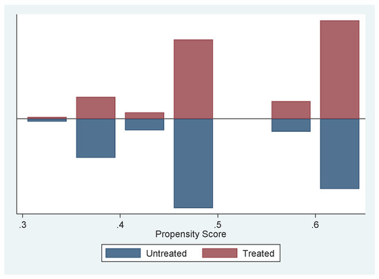 As shown in Table 6 and Figure 8, all observed values are within the range of common values and do not lose any samples. In addition, balance tests for independent and control variables are required prior to PSM estimation. The results of Table 7 and Figure 9 show that the %bias decreases to 0 after matching, and the t value is very significant, which greatly reduces the total bias of matching. However, it is closely related to the fact that all the variables involved are classified variables. Therefore, we believe that the matching effect between the treatment group and the control group is satisfactory and can be used to explain the differences in R&D investments of enterprises.
