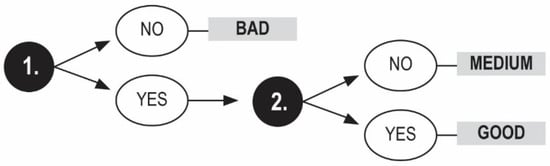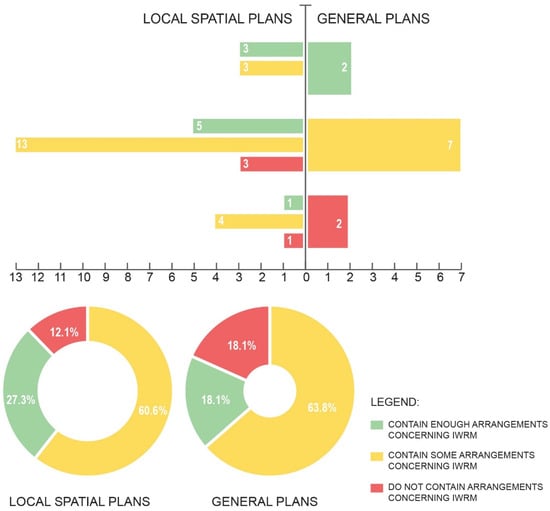 The analysis of the general plans, confirmed by the practical experience of the authors of the research, allowed for such descriptions. The level of subjectivity of the assessment, although allowed in this method, was low here, because the assessment was made based on answers to two questions: 1. Did the planned directions of the spatial development of the commune, shown in the general plan, indicate the necessity to take into account the problems of water and sewage management when drawing up management plans? 2. Were these findings addressing several water management issues and were they mutually consistent? According to the answer: yes or no, the grades of the plan were assigned: bad, medium or good (Figure 2). In the illustrations of the results, these grades were also assigned colors (bad in red, medium in yellow, good in green).