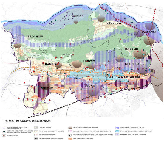 The map of areas of spatial and hydrological problems. Source: “Water and space management program”, Marshal’s Office of the Mazowieckie Voiodeship, 2016, from the author’s archive.