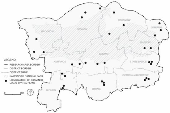 It seems that proper regulation of water management rules in such a specific, demanding area would improve the current situation. For this area, and thus for Kampinos and its surroundings, a water and space management program was developed by the Marshal’s Office of the Mazowieckie Voiodeship in 2016, although it has not yet been implemented. This program is to be concentrated on new investments in hydrological equipment. Spatial planning issues are neglected although many problem areas are noted here (Figure 4). That is why we decided to research the situation with planning documents within the entire problem area covered by this program, concerning 11 communes belonging to three poviats. The authors investigated the provisions of local documents regarding spatial planning and the occurrence of water problems. The choice of plans was made according to the methodology described in the previous section, and the distribution of the assessed plans on the map of the study area is presented in Figure 5.
