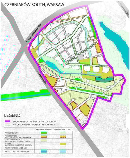 - Local Plan of the South Czerniaków, in the Mokotów District, Warsaw, adopted by the Warsaw City Council on 4 July 2019, Resolution No. XV/349/2019. Available online: https://architektura.um.warszawa.pl/plany-miejscowe (accessed on 17 August 2021).
