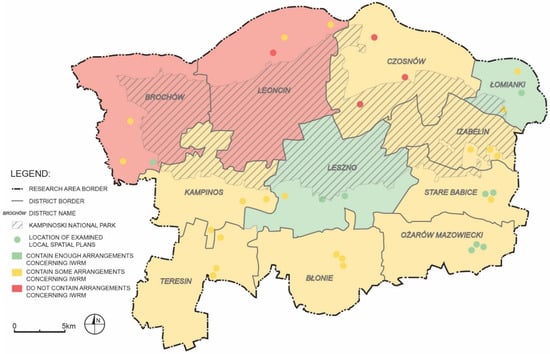 Worldwide, more and more integrated water management instruments are being used. Reports and studies show that many are still in the early stages of implementation, and this applies to many different countries. There is a clear need to support any action to improve the situation by acting on the ground, tracking legislative changes and the promotion of good practice [12]. Implementing resilient strategies faces many difficulties also in Poland [13]. Policies at different levels of planning are not sufficiently integrated. The role of inter-communal spatial planning and programming of integrated actions, i.e., joint adoption of appropriate planning provisions and elements carrying out mutually agreed-upon investments by various stakeholders, is not sufficiently examined. Above all, however, it is crucial how the IWRM and flood risk management policy is implemented at the local level. Assuming that local spatial plans are one of the most important instruments of spatial policy implementation [14,15,16], attention should be paid to what provisions supporting sustainable water management are used in such documents.