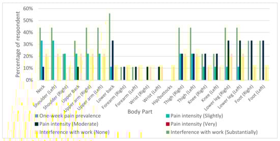 On the other hand, 33% of the respondents reported moderately uncomfortable pain in the lower legs and feet. In addition, the reported pain in the lower back slightly interfered with the ability to work for 33% of respondents. In comparison, 22% reported pain in the neck, thighs, knees, lower legs, and feet, which slightly interfered with the ability to work. The reports of pain in various body parts are consistent with the findings, as the warehouse workers were involved in various MMH tasks [31].