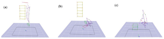 Skeleton Diagram of the Participant Carrying Out the HS Binning Process with (a) Reaching (b), Crouching Posture, and (c) Participant Kneeling and Crouching during the LS Binning Process.