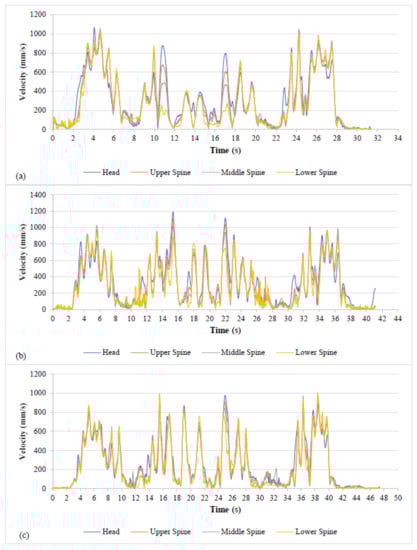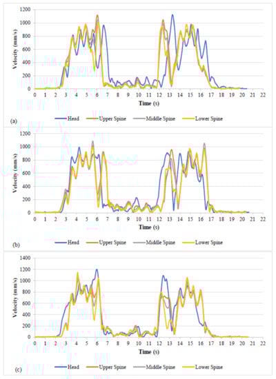 Velocity profiles of the head and spine during LS binning process for (a) participant A, (b) participant B, and (c) participant C.