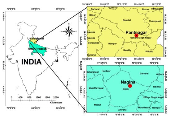 Figure 1 demonstrates the location map of the Nagina and Pantnagar stations positioned in Uttar Pradesh and Uttarakhand States of India. The monthly climatic data of mean air temperature (T, °C), relative humidity (RH, %), wind speed (u, m/s), and solar radiation (Rs, MJ/m2/month) of Nagina and Pantnagar from 2009 to 2016 (8-year) were collected from the Rice Research Station of Bijnor district in Uttar Pradesh State (India), and the CRC (Crop Research Centre, Pantnagar, India) of the G.B. Pant University of Agriculture and Technology, Uttarakhand State. The 8-year monthly climatic data of both sites was portioned into two phases: (i) a calibration phase that includes 60% data from 2009–2013, and (ii) a validation phase that contains 40% data from 2014–2016 for evaluation of machine learning against empirical models. Likewise, Table 1 summarizes the information about the geographical coordinates and descriptive statistics, i.e., minimum, maximum, mean, standard deviation, skewness, and kurtosis, of both stations from 2009 to 2016. It was noted from Table 1 that the maximum ETo variation was of 6.76 mm/month at Nagina and 7.68 mm/month at Pantnagar.