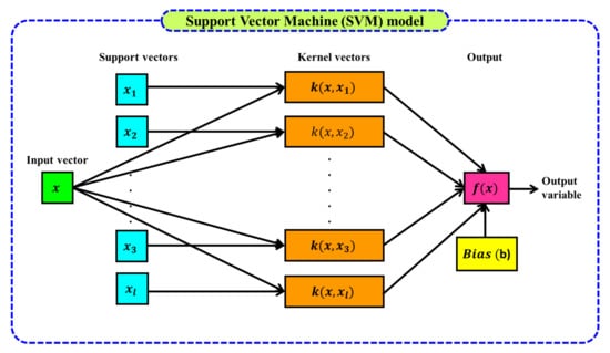 where = kernel function (KF), i.e., . The choice of an appropriate kernel function improves the performance of the SVM model. A variety of KF are available but the most reliable and efficient is the RBF (radial basis function) [37,46]. The RBF is expressed as [40]: