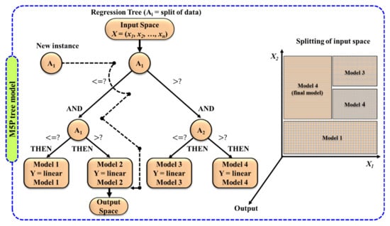where defines a group of samples that grasps the nodes and signifies the subgroup of samples that have the jth consequence of the latent set. In recent times, researchers have explored the successful application of the M5P model in the simulation of several hydrological processes like drought forecasting [50], infiltration simulation [51], river discharge forecasting [52,53], reference evapotranspiration estimation [49,54], stage-discharge forecasting [55], and groundwater level prediction [56]. For comprehensive information about the M5P tree, readers refer to Quinlan [48].