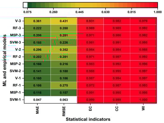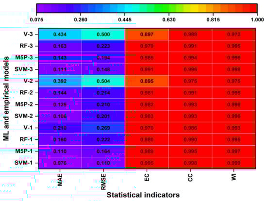 Afterward, five statistical indicators, i.e., MAE (mean absolute error), RMSE (root-mean-square error), EC (efficiency coefficient), CC (correlation coefficient), and WI (Willmott index), were utilized to evaluate the predictive efficacy of the empirical (i.e., V-1 to V-3) and ML (i.e., SVM, M5P, RF) models used in the present study. Also, the graphical inspection includes temporal variation graphs, scatter plots, and Taylor diagrams that were used to make a clear interpretation of results yielded by the empirical and ML models. Table 4 shows the formulas of MAE, RMSE, EC, CC, and WI along with their range.