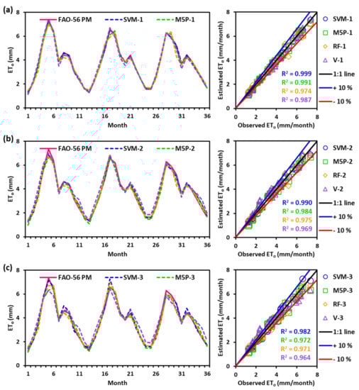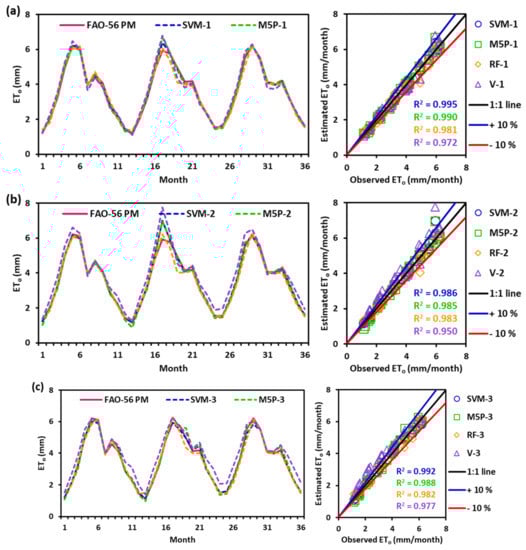 where = reference evapotranspiration in mm/month, = slope of saturation vapor pressure in kPa/°C, = net radiation in MJ/m2/month, = soil heat flux density in MJ/m2/month, = psychrometric constant in kPa/°C, and and = saturation and actual vapor pressures in kPa. The computed time-series values of monthly ETo by the FAO-56 PM model were considered as reference data to appraise the performance of the empirical models (i.e., V-1 to V-3) and ML models (i.e., SVM, M5P, and RF).