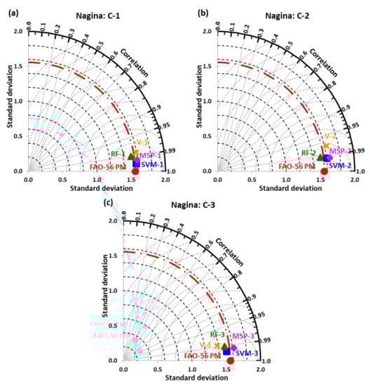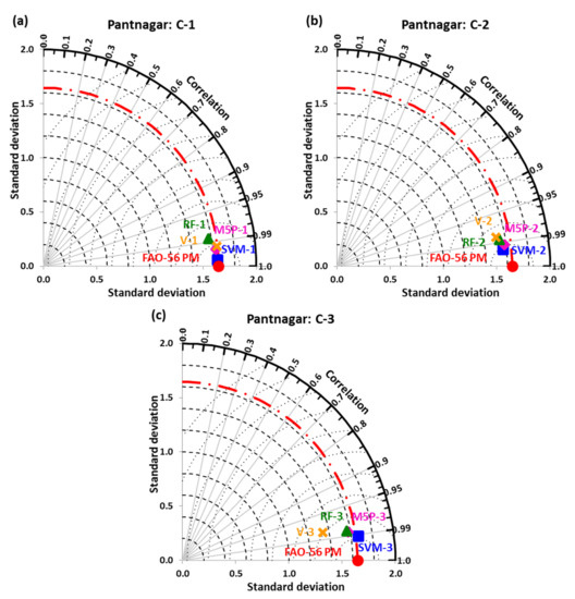 Taylor’s diagram of ML and empirical models corresponding to (a) C-1, (b) C-2, and (c) C-3 input combinations during the validation stage at Pantnagar station.