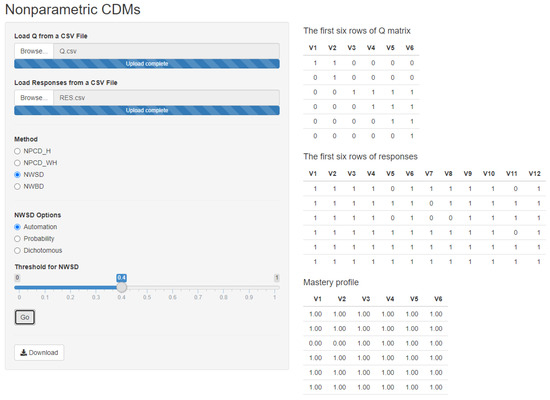 A web graphical user interface (GUI) was developed using R shiny [43] and can be found at https://chenghsuanli.shinyapps.io/NPWCD/ (accessed on 18 March 2022). Figure 1 presents the diagnostic results of examinees by applying NWSD from the website. Teachers can obtain the list of mastery skills through the following four steps by the chosen nonparametric CDMs.