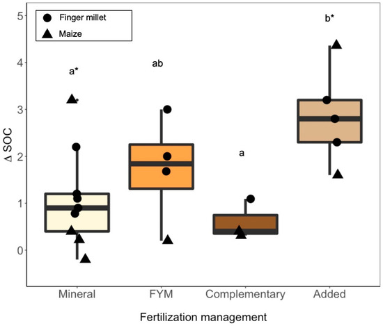 Increases in SOC (g kg−1) relative to control soils (∆SOC) from different fertilization management treatments (min = mineral fertilization; FYM = farmyard manure; complementary = min and FYM added up to the total recommended N dose for the specific crop; added = combination of total recommended N mineral fertilization with additional FYM) in maize and finger millet cropping systems in India using data provided from the studies described in Table A2. Different letters represent significant differences between the treatments after analyses of variance, and asterisks represent significant differences from zero after individual one-sample t tests (p < 0.05).