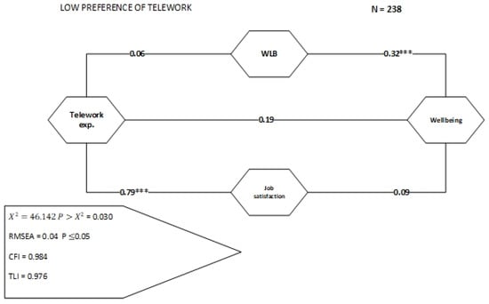 | Model 2a: Low in telework preference. Wellbeing, telework experience, job satisfaction, and Work-Life balance: subsample 1 | ||||||